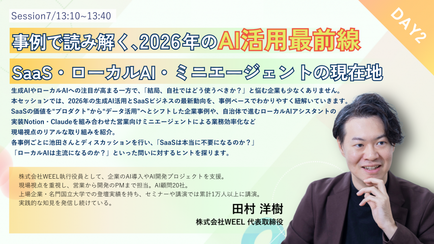 本セッションでは、SaaSの価値が「プロダクト提供」から「データ活用」へと移行している事例や、自治体におけるローカルAIアシスタントの実装、NotionやClaudeを活用した業務特化型ミニエージェントの実践例を紹介します。理論ではなく、現場で成果を出している取り組みを軸に解説いたします。