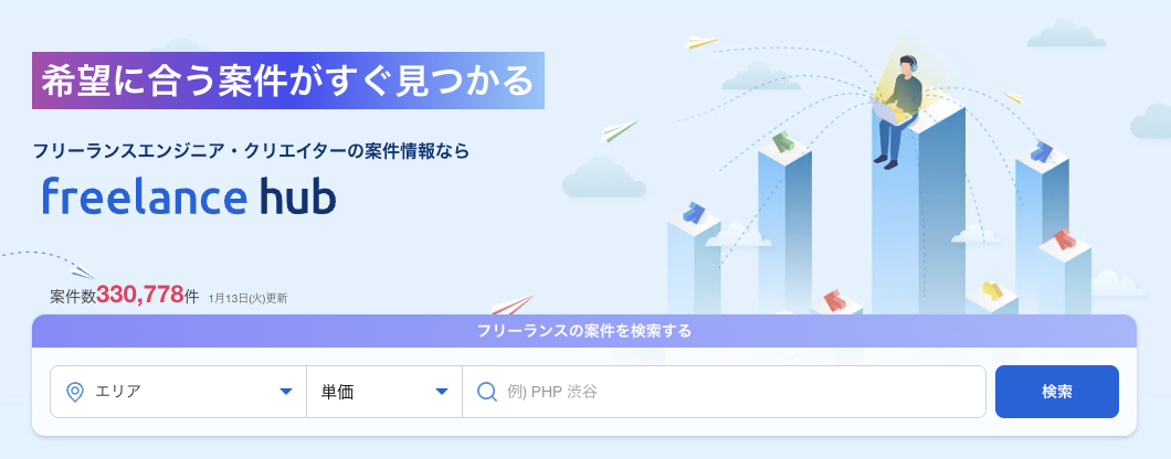 「フリーランスHub」は、全国のフリーランス向け案件情報をはじめ、IT・AI領域のトレンドやキャリアに役立つ情報を発信している専門メディアです。また、フリーランス向けの案件情報も一覧で掲載されており、AI・IT領域に関心のある方にとって有益な情報がまとめられています。