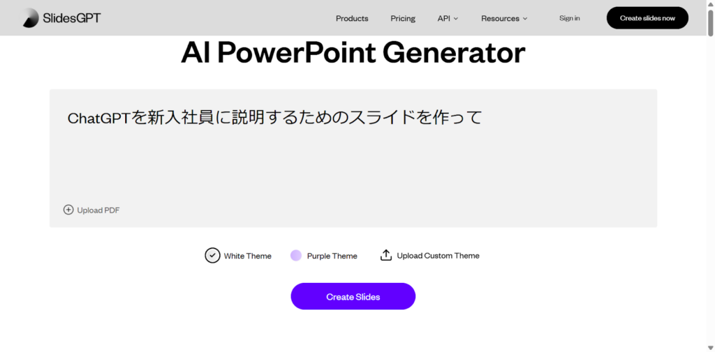 ページに入ると、以下の画面が出てきます。なんと、この画面からもうスライドを作成することができます。入力ボックスに作りたいスライドの指示文を入れるだけです。