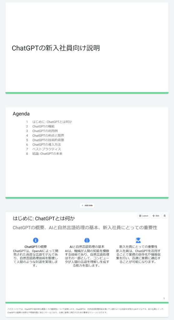 「ChatGPTを新入社員に説明するためのスライドを作って」というプロンプトだったので、これをもっと詳細にすればより良い出力をしてもらえるでしょう。