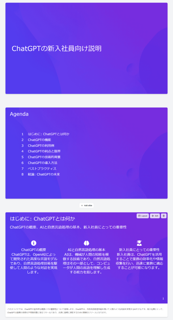 それでは、SlidesGPTを実際に使ってみます。試しに、「ChatGPTを新入社員に説明するためのスライドを作って」と頼んでみました。