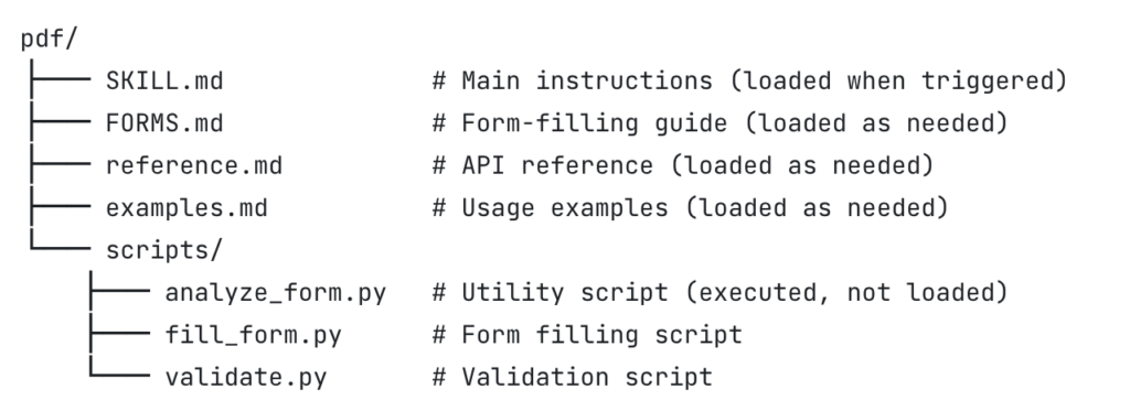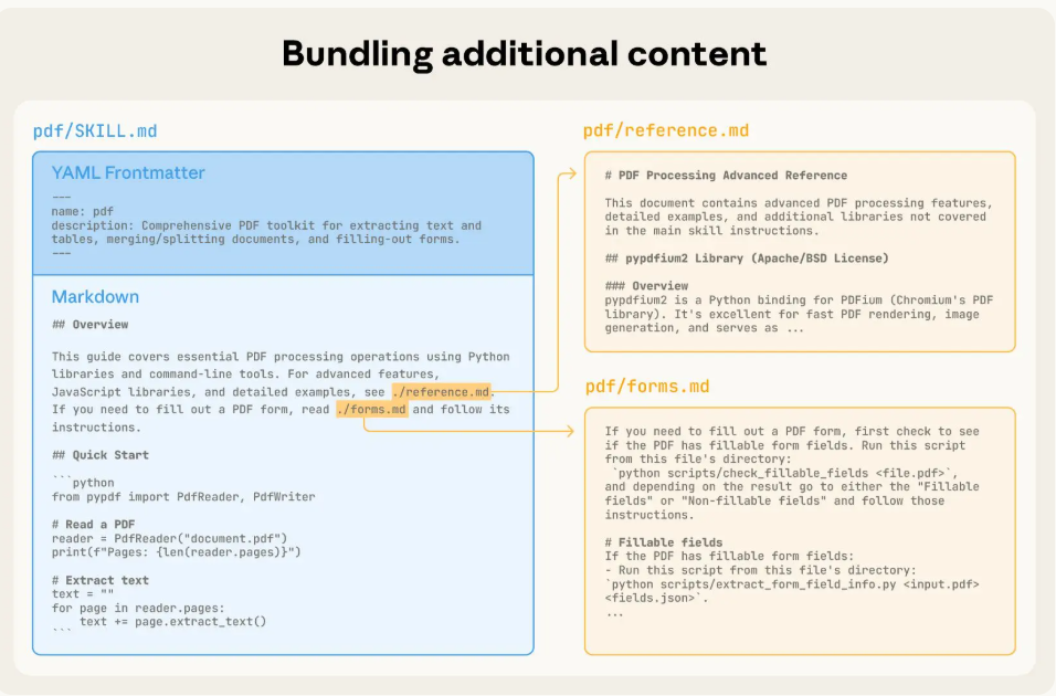 Claudeは起動時にこのメタデータを読み込み、ユーザーの入力内容からどのスキルを適用すべきかを判断。必要に応じて関連ファイル(例:reference.md、forms.mdなど)を自動的に参照 。