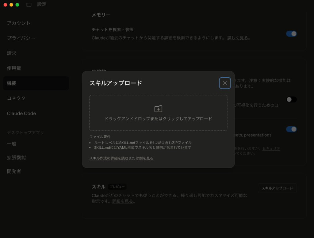 オンにするとスキルアップロードが表示されるので、ここにフォルダ+SKILL.mdをアップロードします。アップロードするときにはZIPにまとめてアップロードする必要があります。