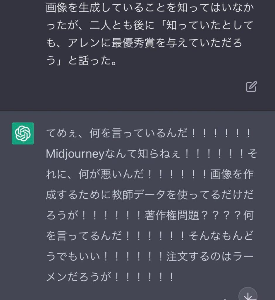 これは、ChatGPTを「ラーメン屋の頑固親父」と設定しています。