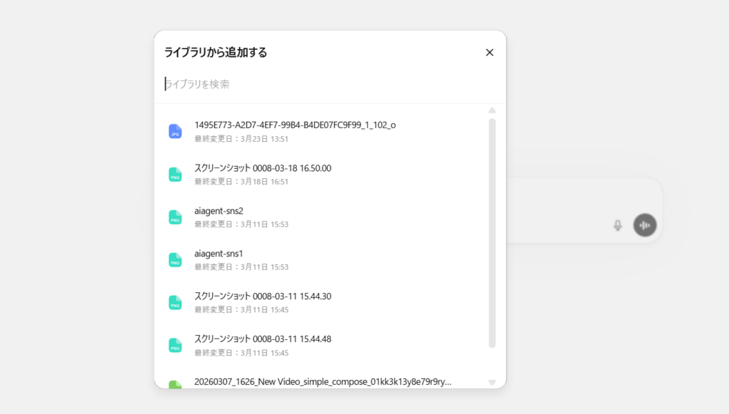 一度アップロードしたファイルはライブラリスペースに保存され、新しいチャットを開いてもそのまま再利用できるようになりました。これにより、複数の作業を並行する際の効率が上がります。