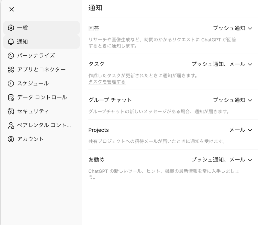 Web版ChatGPTの設定画面から「通知」を選択すると、スケジュール一覧を見ることができるので、こちらでChatGPTタスク・スケジュールの管理も可能。