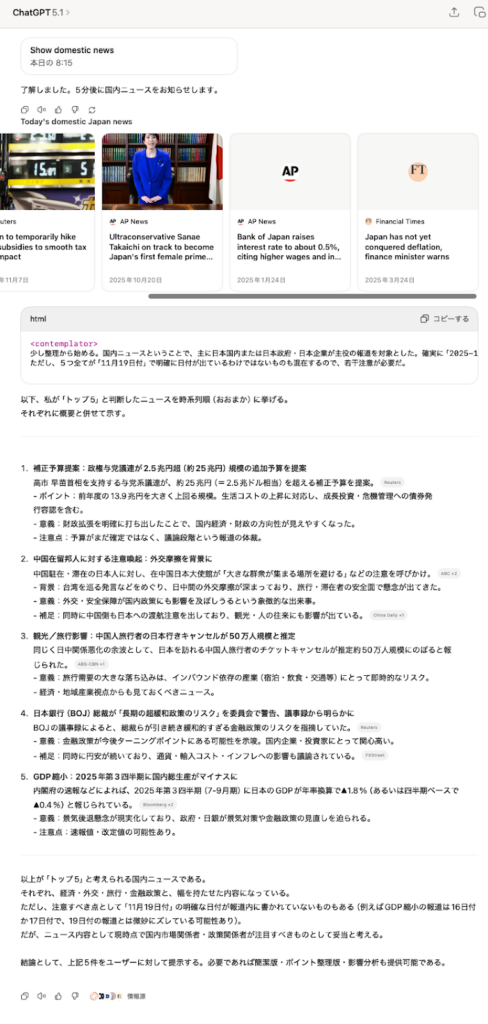 指定した時刻になると、ChatGPTが主要メディアの新着記事を取得し、必要に応じて要約や翻訳まで行ってくれます。元記事のURLも付与されるため、そのまま詳細を確認できる点が便利です。
