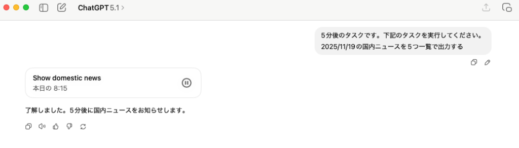 このように、単にリマインドしてくれるだけではなく、入力するプロンプト次第では指定した時間に何かのタスクをこなすこともできるようになりました。