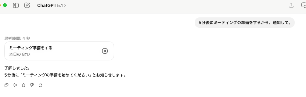 これは、いわゆるリマインダー機能のようなもので、「〇〇日の〇〇時に、会議が入ったからリマインドして」などといった自然言語でChatGPTに依頼することで、リマインドを設定することができます。