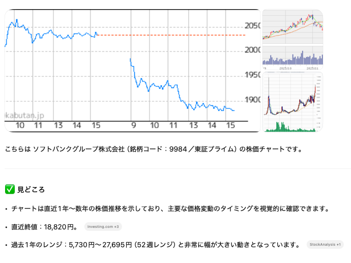 タスクを設定すれば、ChatGPTが株価情報を取得し、必要に応じてグラフ表示にも対応します。期間指定もワンクリックで行えるため、投資判断や日次のチェックを効率化したいときに役立ちます。