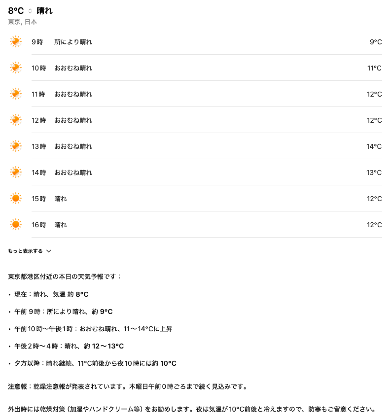 毎朝の天気情報を自動で受け取れるようにしておけば、出勤や外出の準備がスムーズになります。生成AIの特性を活かして、その日の気温差や注意点なども併せて提示させることができるため、通常のリマインダーよりも実用的に活用できます。