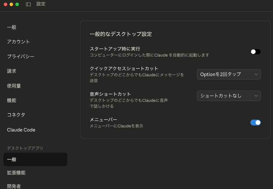 このように、Claude Desktopはブラウザを開くことなくAIをすぐに起動できる点が特徴。ファイル要約や翻訳、コード補助といった基本機能に加え、ショートカットと拡張機能を組み合わせることで、業務全体の効率を大幅に高めることができます。