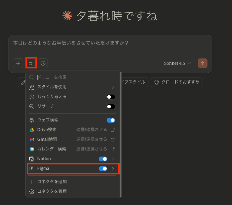 インストール後はチャット画面の「検索とツール」ボタンから利用したいツールを選択し、権限を付与することで、Claudeがそのまま外部サービスを操作できます。試しにFigmaをインストールしましたが、ちゃんとインストールされているのがわかります。