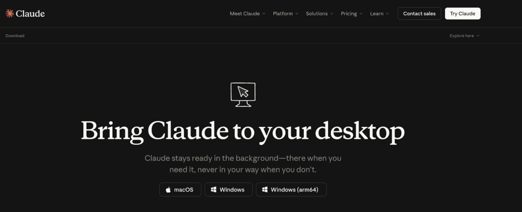 Claude Desktopを利用するには、まず公式サイトのダウンロードページにアクセスし、自分のOSに合ったインストーラを取得します。