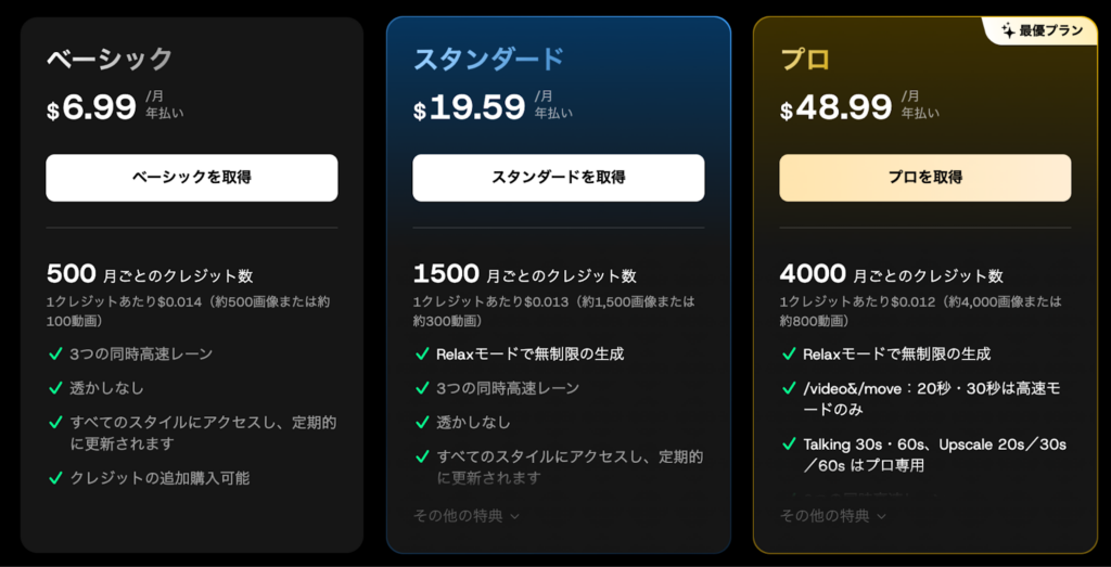 また、DomoAIから出力した画像や動画を商用利用したい場合は、スタンダードプラン以上のプランに加入する必要があるため、商用利用したいけど少しでも費用を抑えたいというユーザーにおすすめのプランです