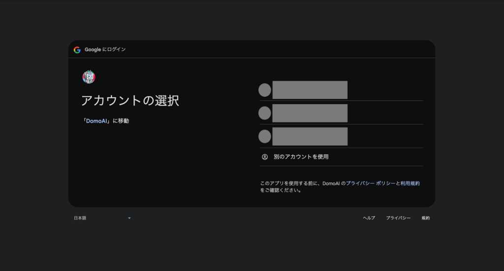 次に、DomoAIで利用するGoogleアカウントを選択する画面になるため、任意のアカウントを選択してください。