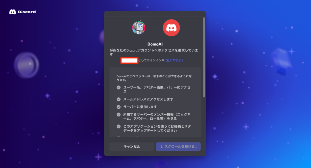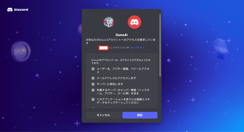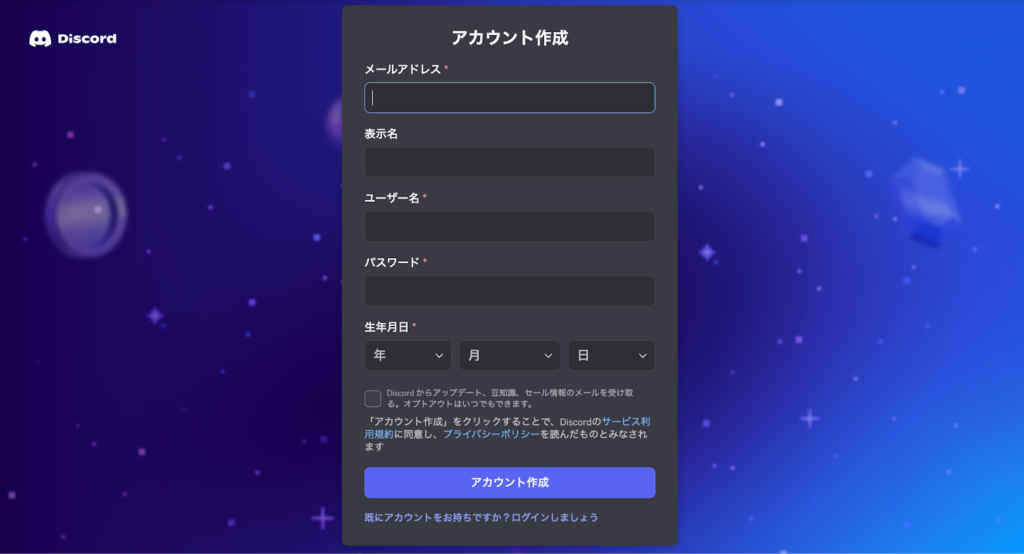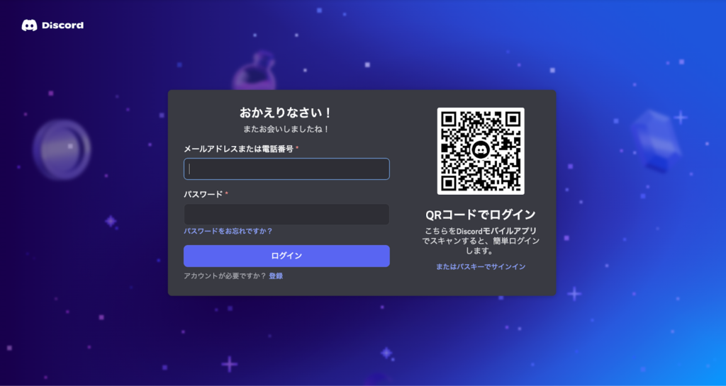 クリックするとログイン画面へ移動するため、Discordアカウントをお持ちの方はアカウント情報を入力し「ログイン」ボタンを押してください。