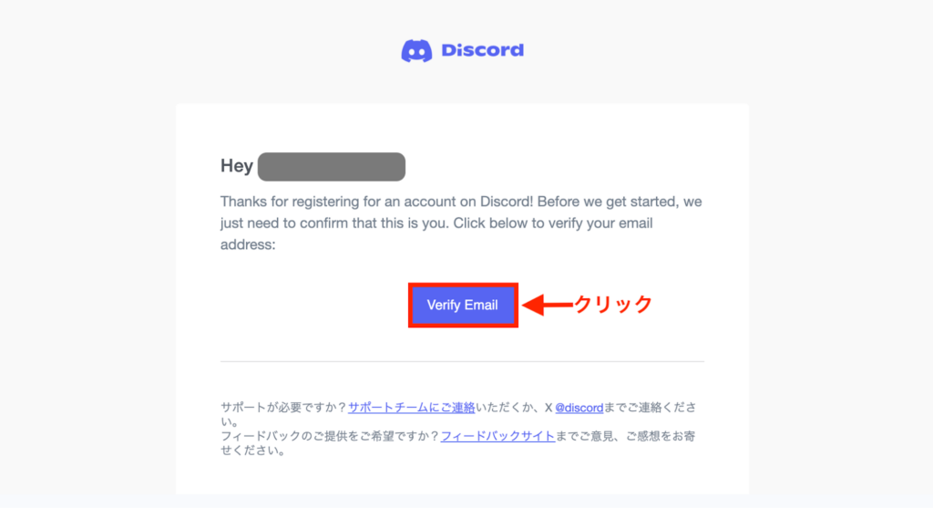 「アカウント作成」ボタンクリック後は上記の画面へ移動するのですが、こちらの画面で操作する前に、Discordアカウントのメール認証を行う必要があります。