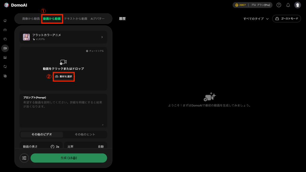 画面が上記の画像のように移動したら①の「動画から動画」をクリックし、②の「素材を選択」をクリックして利用したい動画をアップロードしていきます。