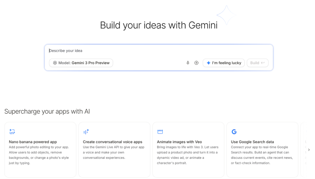 Google AI Studioでは、画面左側のサイドバーにある「Build」機能を使って、生成AIを活用したアプリを簡単に開発できます。プログラミングの専門知識がなくても、用意されたテンプレートをもとに構成を選び、モデルを組み込むだけでアプリを素早く構築可能です。