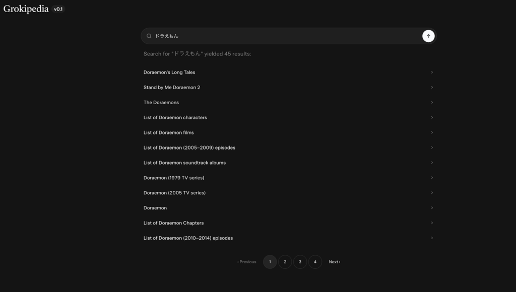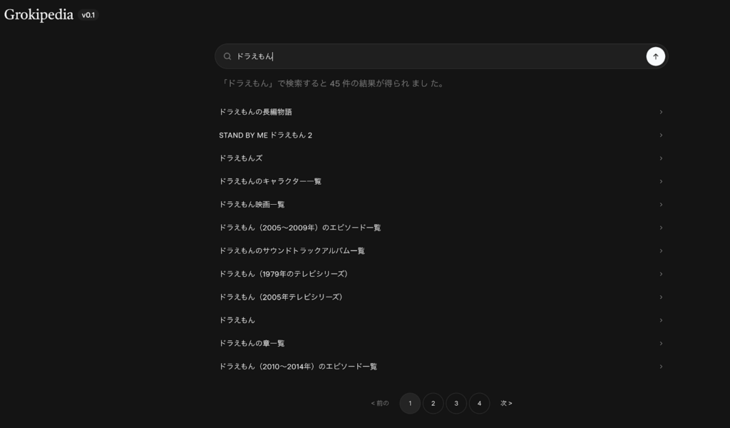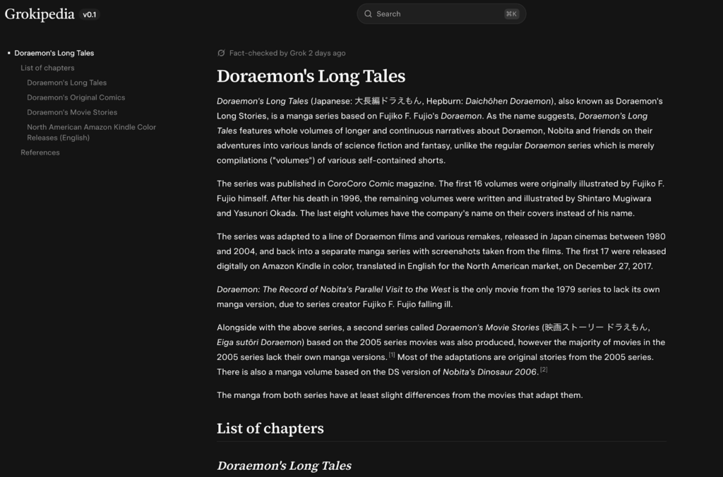 Grokipediaの対応言語は2025年10月時点では「英語」としか記載されていませんが、「ドラえもん」と日本語で検索をしたところ、下記のように表示されました。
