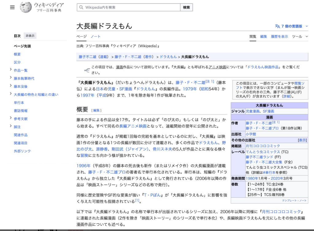 Wikipediaの「大長編ドラえもん」ページは、作品一覧、区分(執筆時代など)、出版・連載データ、背景・特色、参考文献など、非常に多くの構成要素を備えています。