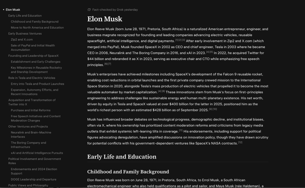 さらに、Wikipedia側には出典リスト、脚注、編集履歴、関連リンクが明確に示されており、読者が「どの情報がどこから来ているか」を確認できる構造になっています。対してGrokipediaのページでは「出典・編集履歴・編集体制」などの透明な表示が十分に見えず、「どこまで信頼できるか」「誰が関わっているか」が分かりにくいという信頼性・検証性の差が感じられます。