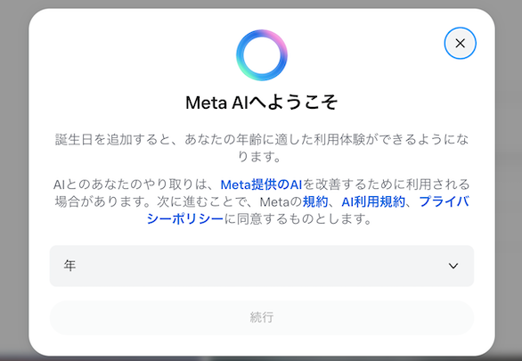 あとはチャット画面でプロンプトを入力するとMeta AIを使えます。初回入力時に誕生年を質問されるので、回答して続行しましょう。
