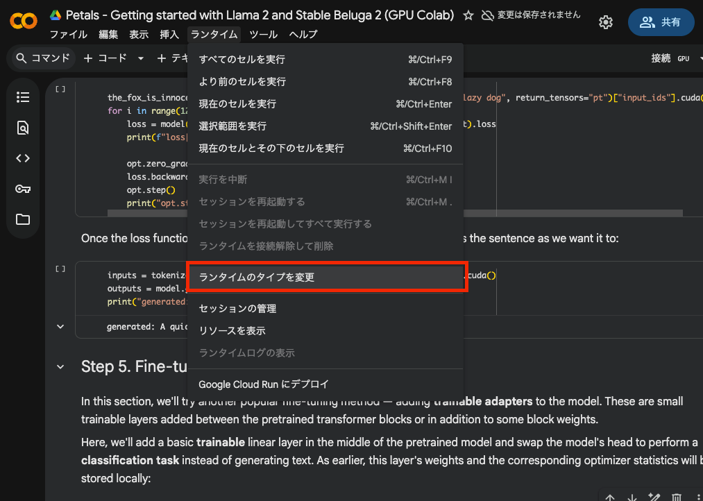GPUを選択します。今回は、共有したColabファイルの初期設定のまま、T4 GPUを使いました。