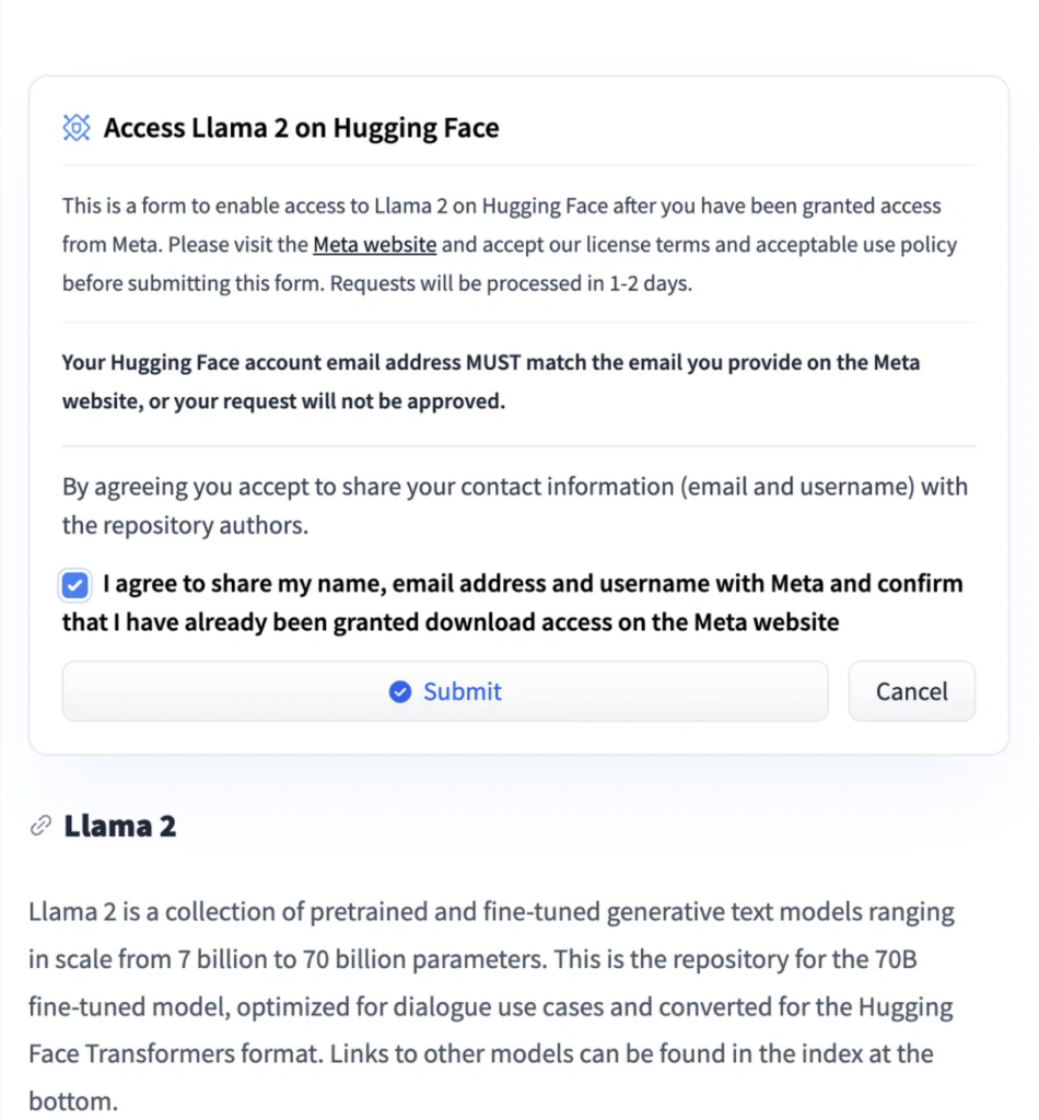ちなみに、”meta-llama/Llama-2-70b-chat-hf”モデルを使う場合は、Metaにアクセストークンをリクエストする必要がありますので、以下の手順でリクエストを送信してください。