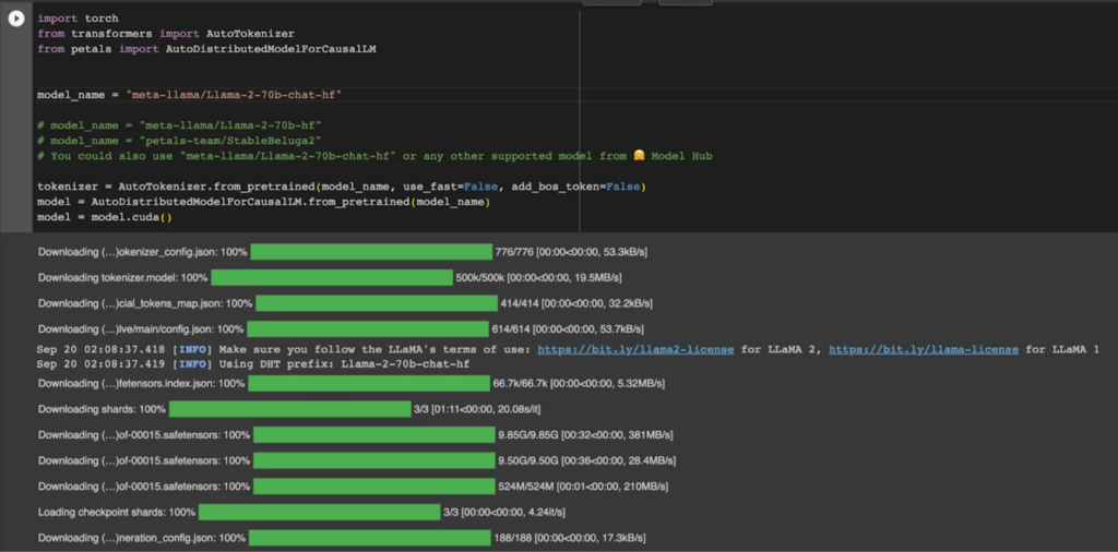 Petals は、家庭用のGPUやGoogle Colabを使用して、Llama 2(70B)、Falcon(180B)、BLOOM(176B)などの大規模な言語モデルの実行を可能にするためのプラットフォームです。