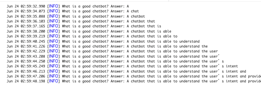 これに対する回答がトークンごとに出力されていきます。