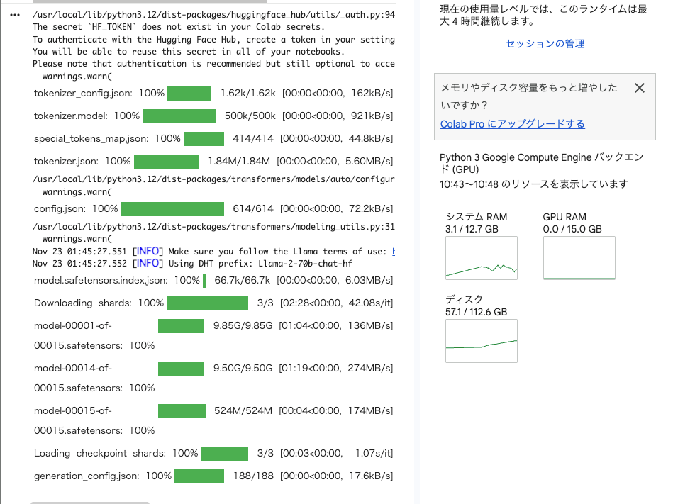 以下を実行し、同様にLlama-2-70b-chat-hfモデルをロードしました。