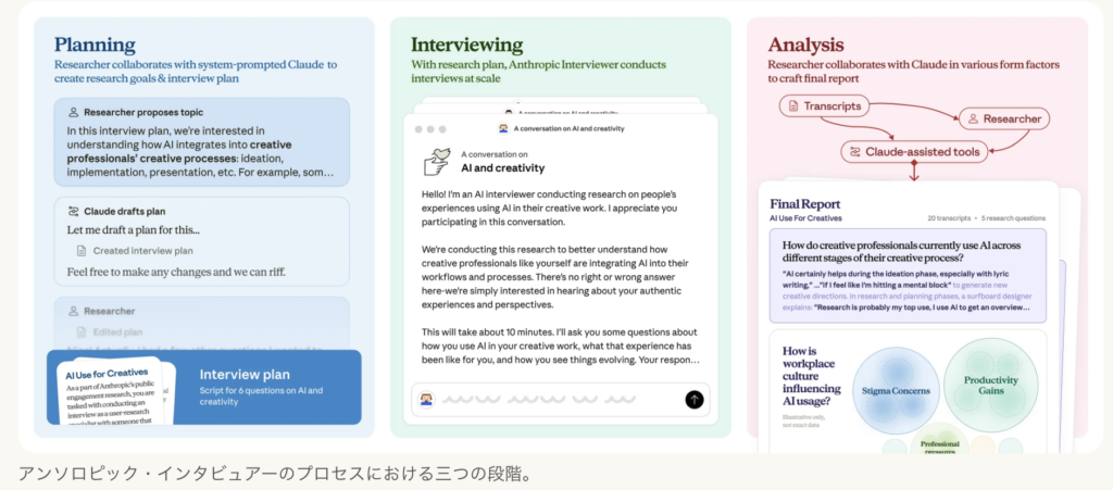 Anthropic Interviewerは、人とAIの対話を体系的に収集し分析するためのプロセスを備えており、その構造が3つのステージとして整理されています。