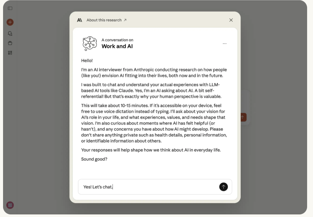 Anthropic Interviewerは、Anthropicが提供するAIインタビューツールで、仕事におけるAI活用とその影響を大規模に調査することを目的としたプロダクトです。