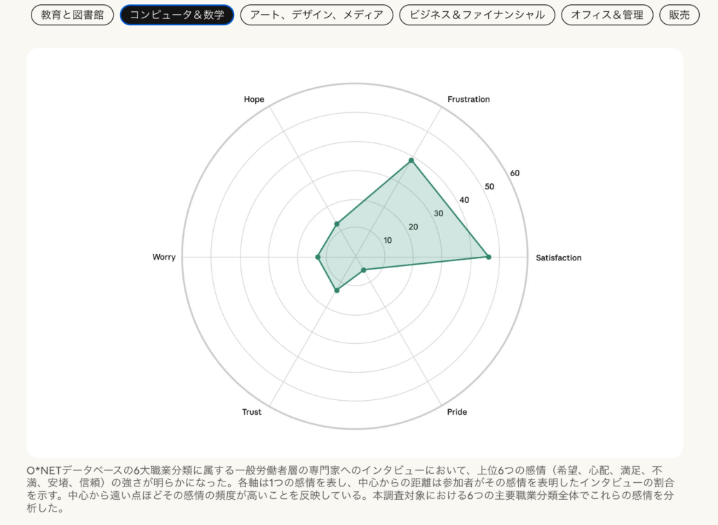 AIとの対話が「人の能力を拡張するために使われているのか」「作業の自動化に使われているのか」を分類した点が特徴。両者の比率を並べて見ることで、利用者の意図がどの方向に向かっているのかが浮かび上がる構成です。