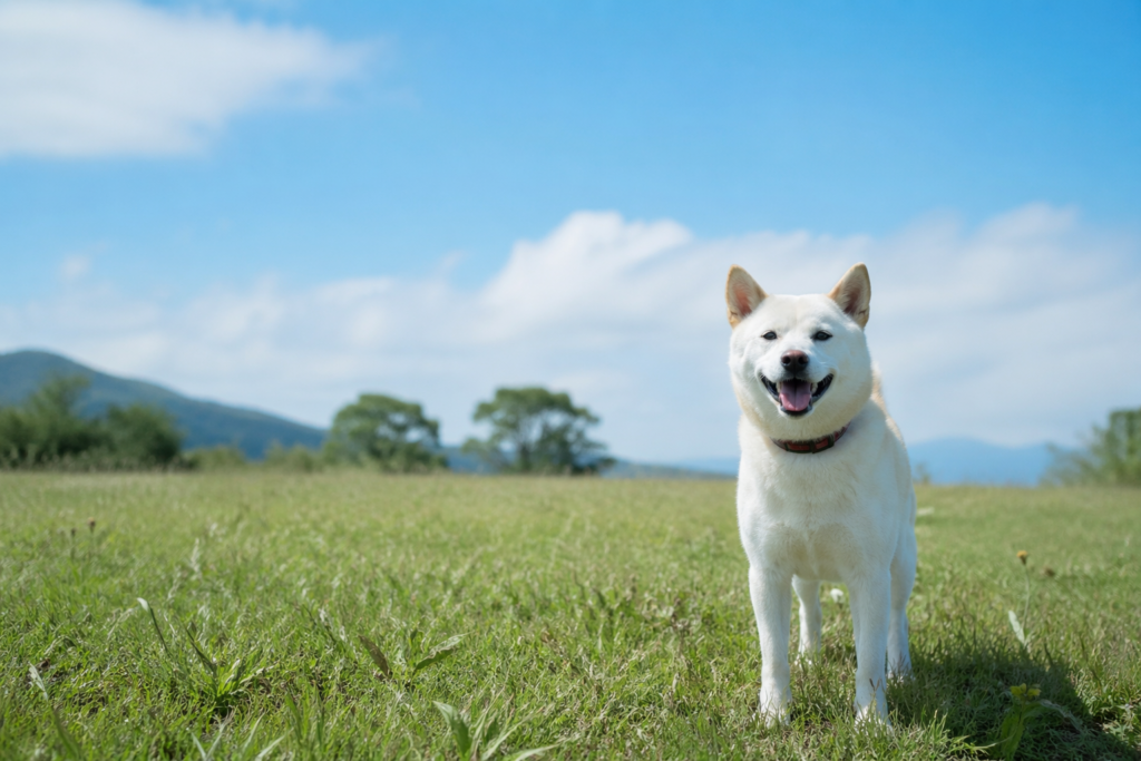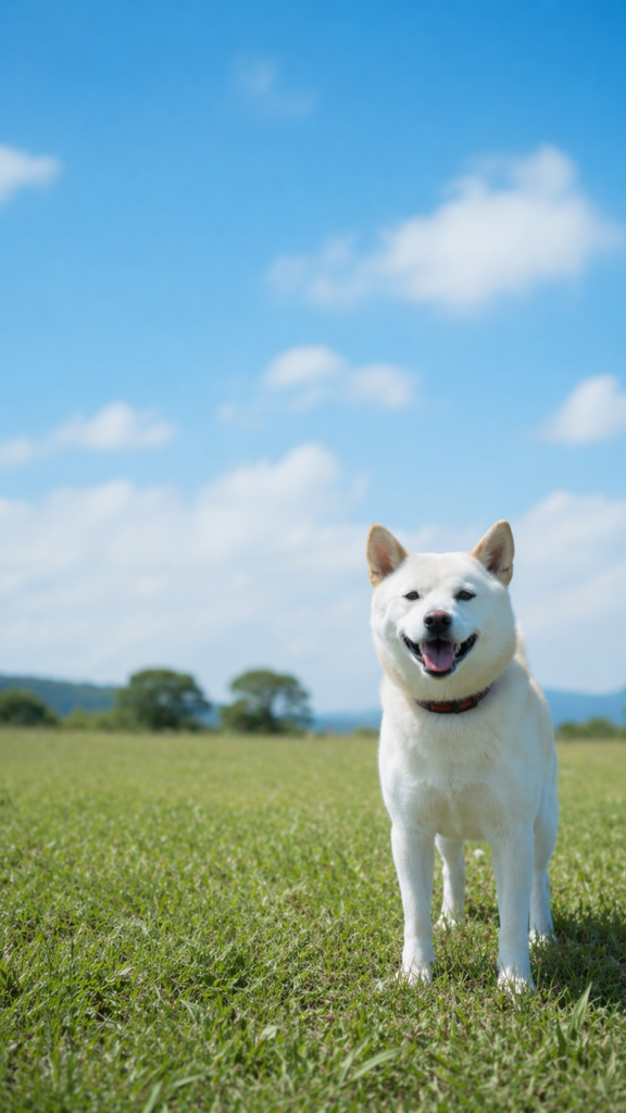 prompt="青空の下で、草原に立つ白い犬。やわらかい光、写真風、16:9、高解像度",