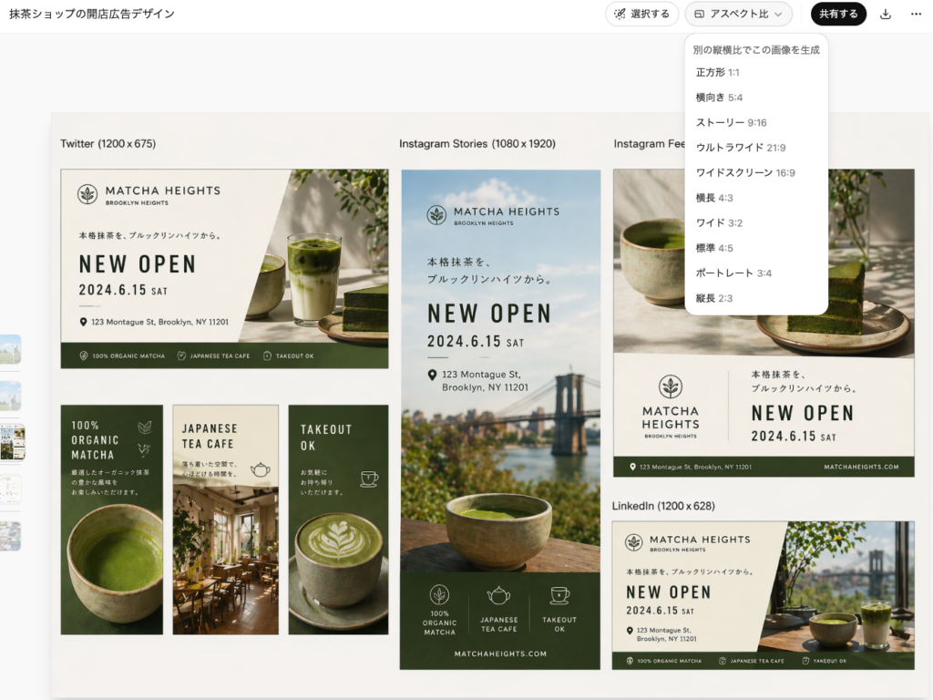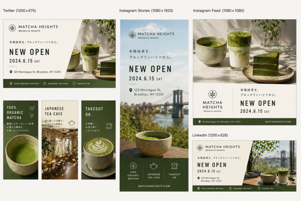 「Brooklyn Heightsに新しくオープンする抹茶店のSNS広告を、Twitter・Instagramストーリーズ・フィード・LinkedIn向けに複数アスペクト比で生成する」というプロンプトを試しました。