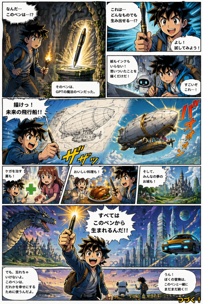 日本の少年漫画スタイルで「GPTの魔法のペンを発見する冒険シーン」を生成するプロンプトを試しました。