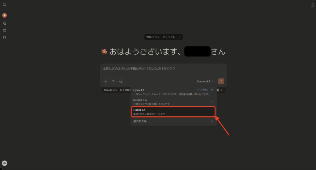 無料プランのユーザでもこのモデルを選択可能であり、特別な設定は不要です。チャットUI上では他のClaudeモデルと同様に、ユーザがメッセージを入力するとHaiku 4.5が応答を返してくれます。