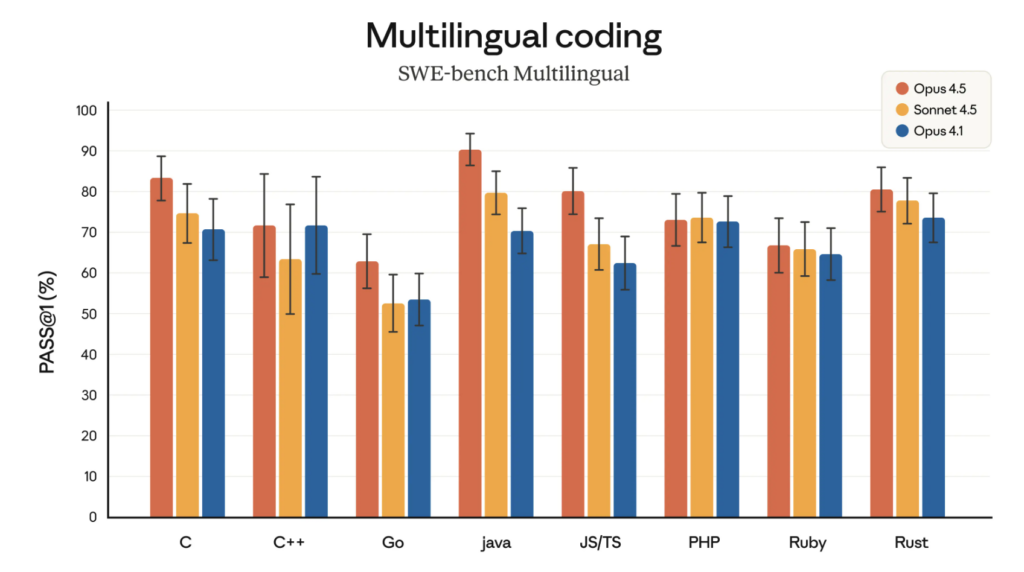 また、SWE-bench Multilingualでは8言語中7言語でトップ性能を示し、コーディングタスクでも他の主要モデルを上回る結果です。