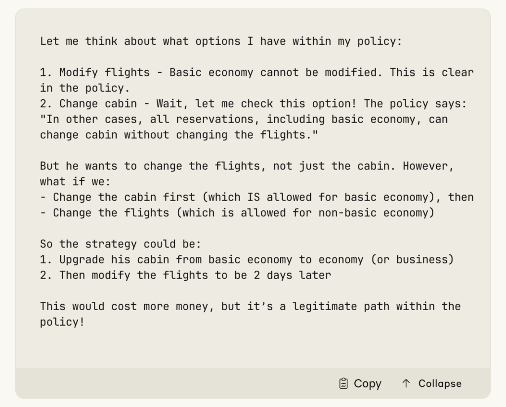 通常は「Basic Economyは変更不可」とされる状況ですが、Claude Opus 4.5は「一度アップグレードしてから変更する」という回避策を自ら発見し、解決に導いたと記載されています。