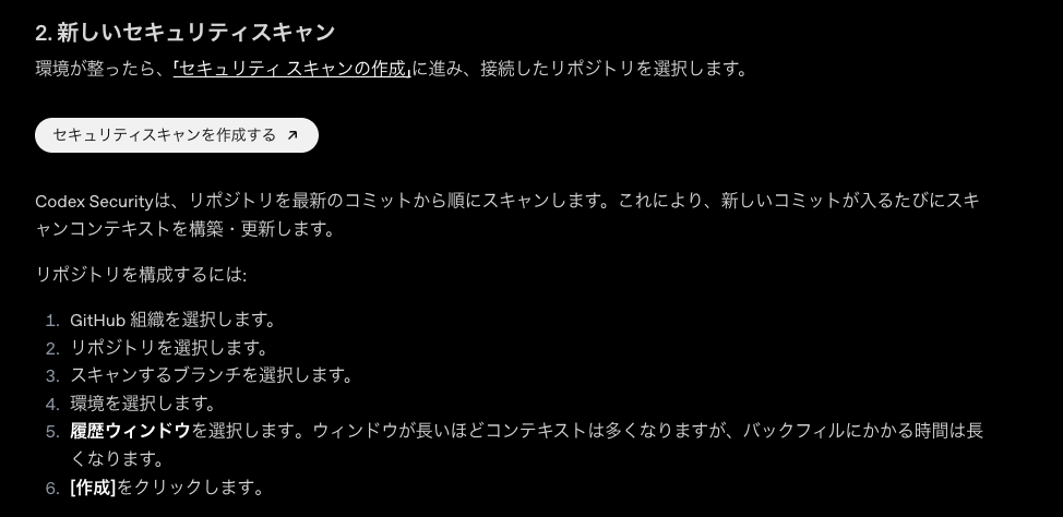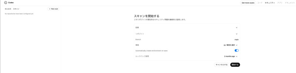 また、スキャンはGitHubリポジトリを前提に実施。対象リポジトリはCodex Webから参照される形となり、セキュリティ分析もこの連携環境で進んでいきます。
