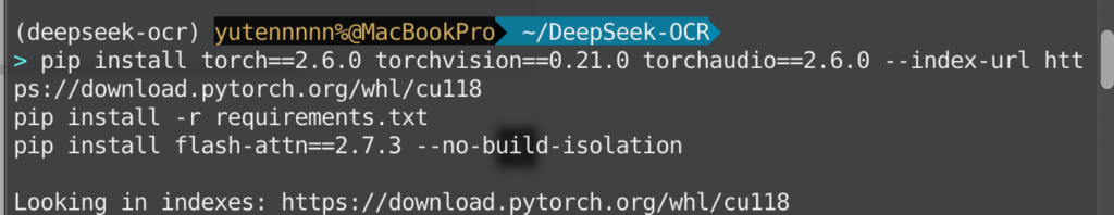 まずはPython環境を用意しましょう。公式では「cuda11.8 + torch2.6.0」が前提にされています。インストールコマンドは次のとおりです。