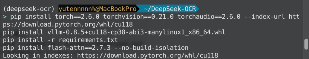 Windowsの方は問題なく実行できるかと思いますが、PyTorchはmacOS Intel(x86_64) 向けの配布を 2.2 系で終了しており、2.3 以降(今回必要な2.6も)のホイールは存在しないので、以下のコマンドを実行しましょう。