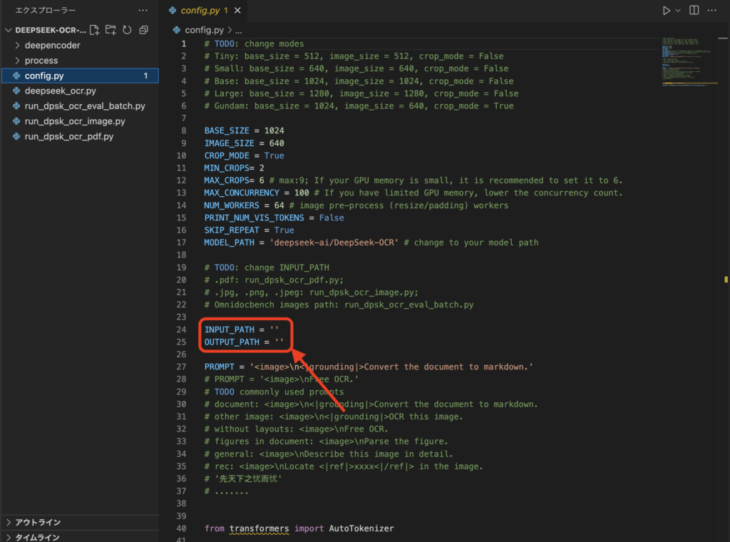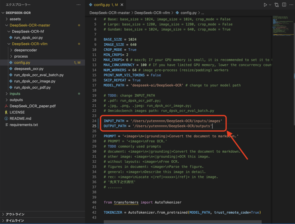 DeepSeek-OCRリポジトリ内の DeepSeek-OCR-master/DeepSeek-OCR-vllm/config.py に、入力フォルダと出力フォルダなどの基本設定がまとまっています。