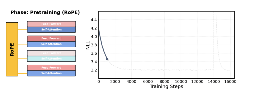 事前学習ではRoPEなどの位置情報を用いる一方で、学習後にそれを完全に取り除く設計がされています。この設計により、学習時に見ていないシーケンス長へのzero-shot一般化が成立。