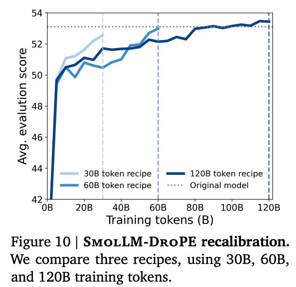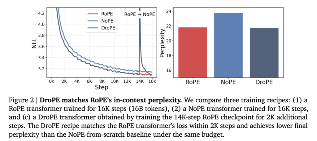 そこでDroPEでは、元の事前学習データを用いた短時間のキャリブレーションを実施。この再学習は、事前学習と同じ文脈長のままで行われます。