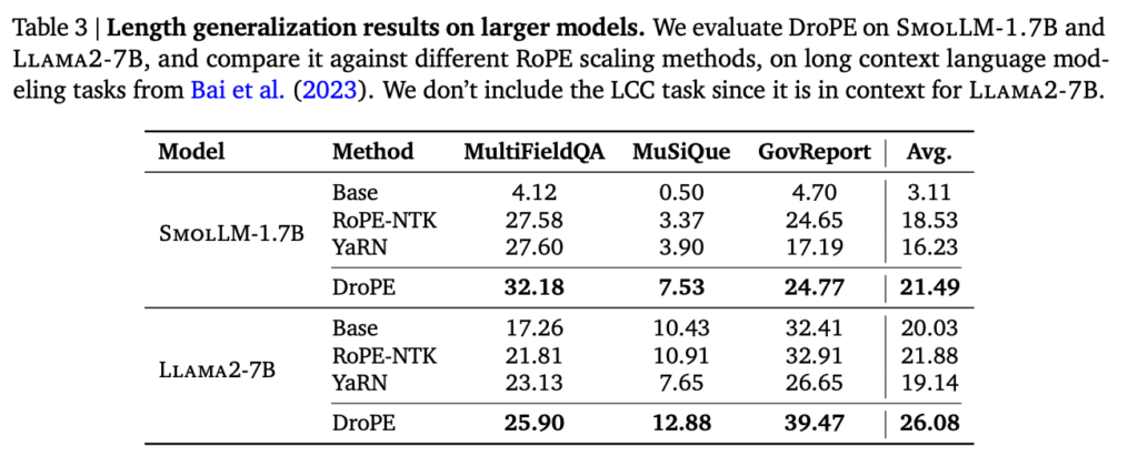 実際に異なるモデル規模にDroPEを後付けで適用した評価結果を、既存のRoPE拡張手法と比較したものが下記の表です。