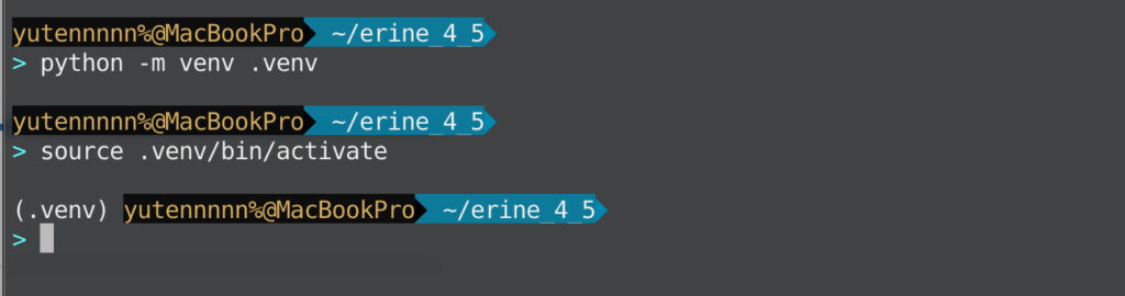 まず環境を整えます。新しい仮想環境を作って、必要なライブラリを入れましょう。